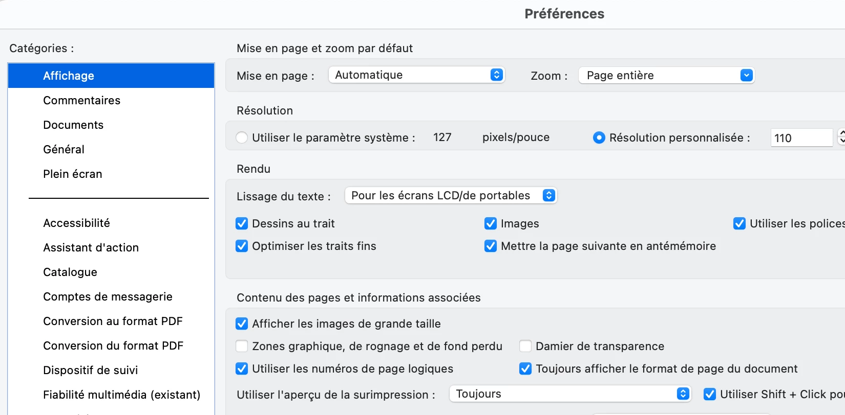 Impossible d'afficher le format de page du document alors que la case est cochée dans les préférences.