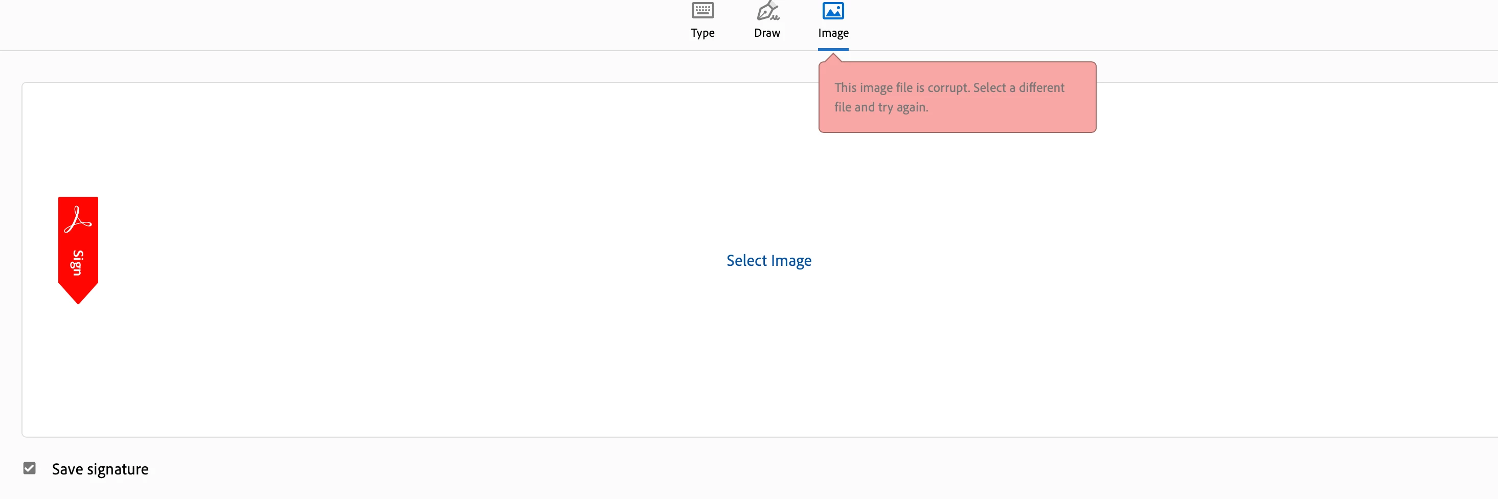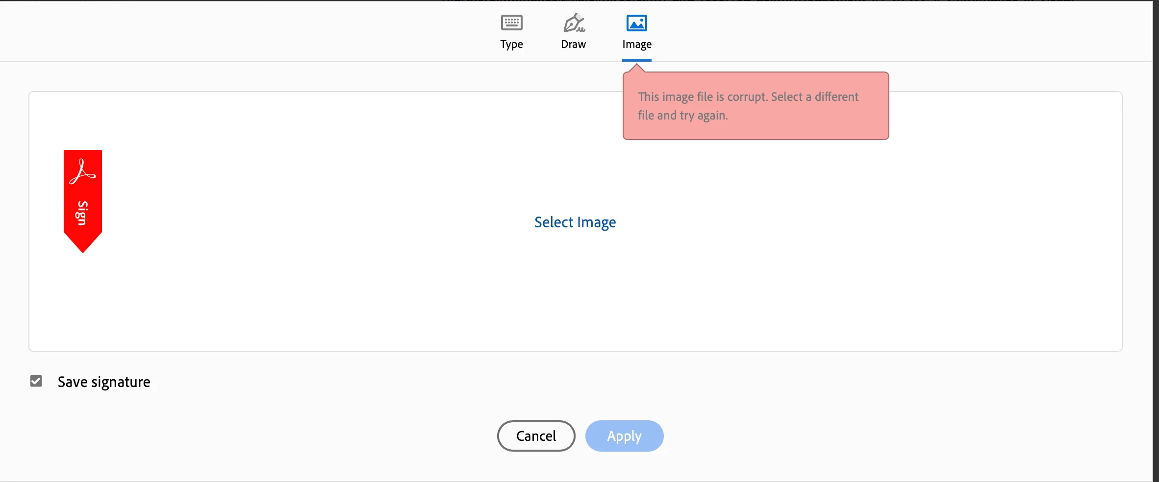 Hi all. I'm trying to sign a document on behalf of a colleague. When I upload their signature via "FILL AND SIGN YOURSELF" as a .jpg or .png I get "This image file is corrupt" in a red box. In attempting to do this I've now removed my own signature, and when I re-up that file, I get the same message. So it is clearly not the image files. Tried rebooting the computer (MacBook Pro) and I have also tried moving the files to my desktop... no dice. What is going on here please?!