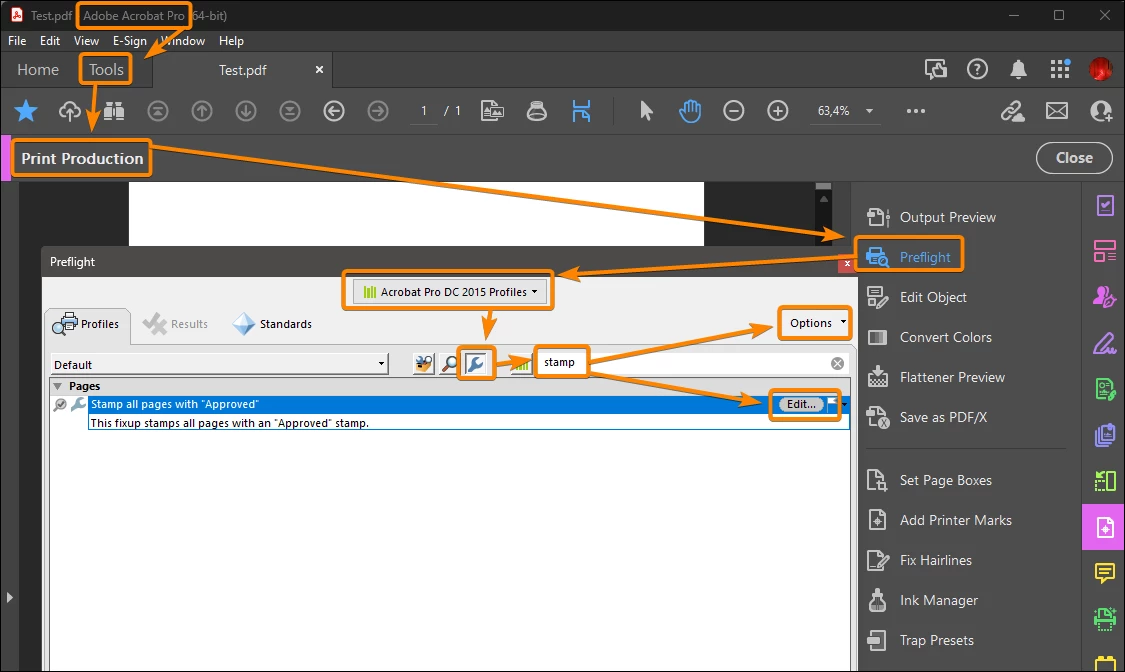 - Edit or duplicate the "Stamp all pages with Approved" profile in the Preflight fixups.