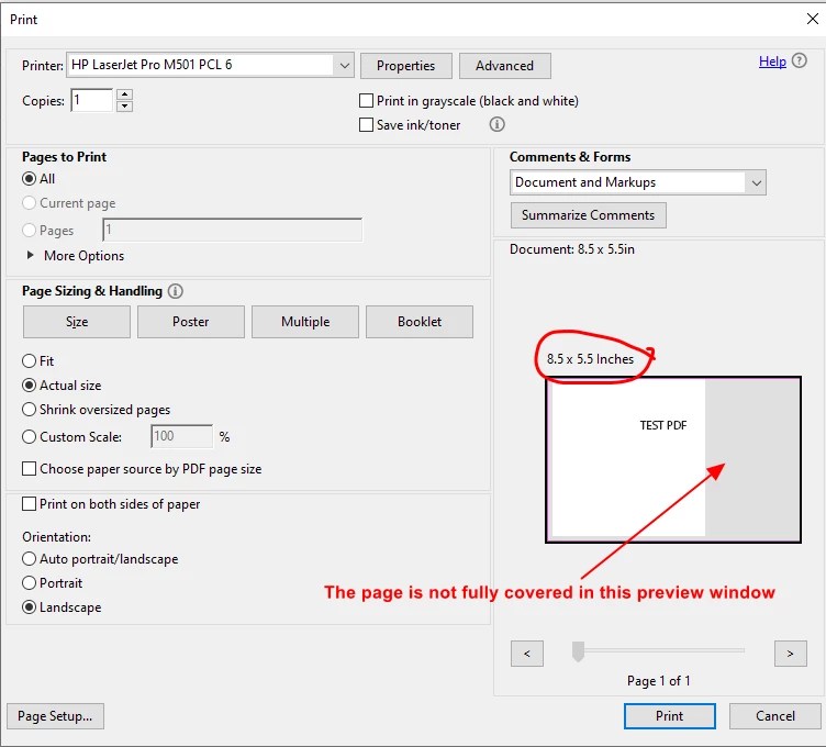 I have converted a 8.5×5.5 inch MS Word file to PDF by Acrobat and while going to print, I can see that the page is not fully covered in the Previewer Window and after pressing "Print" button, it is showing error messages. The page is however spooling off from the printer but blank. Surprisingly, A4 page PDF can be printed well using the same printer.