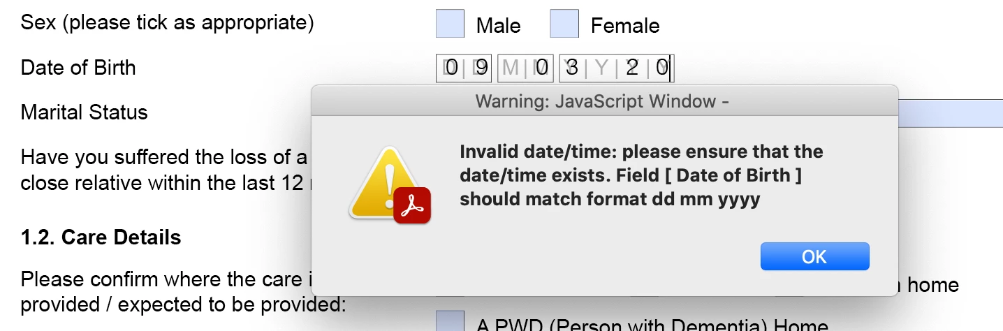 Invalid date/time: please ensure that the date/time exists. Field [ Date of Birth ] should match format dd mm yyyy