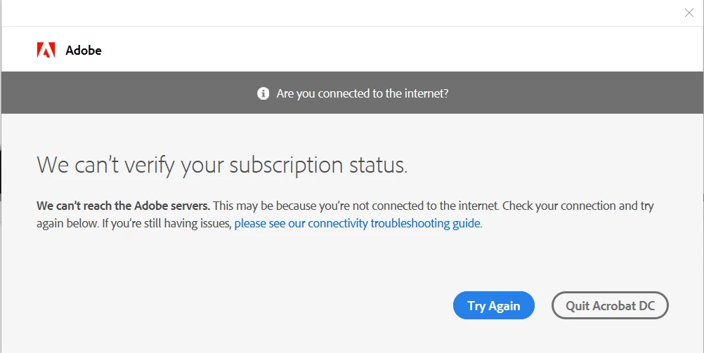 We can’t reach the Adobe servers. This may be because you’re not connected to the internet. Check your connection and try again below. If you’re still having issues, please see our connectivity troubleshooting guide.'