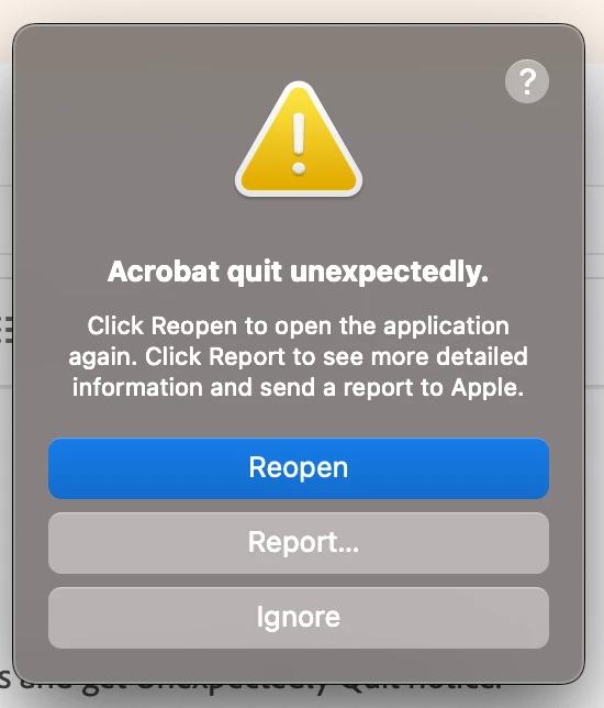 TTrevor22519877r356ParticipantForum|Forum|1 year agoFebruary 28, 2025QuestionAcrobat DC won't open MacForum|Forum|1 year agoFebruary 28, 20252 replies294 viewsRunning Sequoia 15.3.1Acrobat 24.005.20414Mac Mini M2 Launch Acrobat, immediately closes and get Unexpectedly Quit notice.I uninstalled / reinstalled twice, but it's still not opening. I haven't loaded any new software, no updates or changes. Any ideas?PDFCrash or freeze