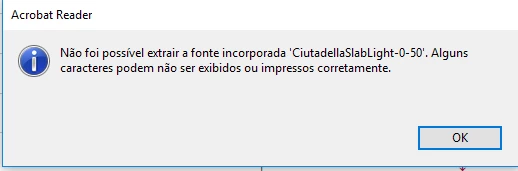 When viewing a PDF file, Acrobat displays an informational message, (It was not possible to extract the embedded font ‘CiutadellaSlabLight-0-50’. Some characters may not be displayed or printed correctly.