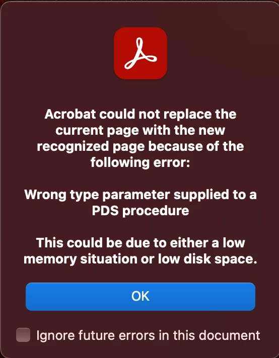 In trying to recognize text in a pdf file, Acrobat (current version for Mac as of 6/2024), I geet an error message about 'wrong parameter supplied to a PDS procedure). I check the box to "Ignore future errors in this document" but Acrobat repeats the same message on the next page. Why doesn't Acrobat "obey" it's own instruction to "ignore." Most annoying. Any ideas?