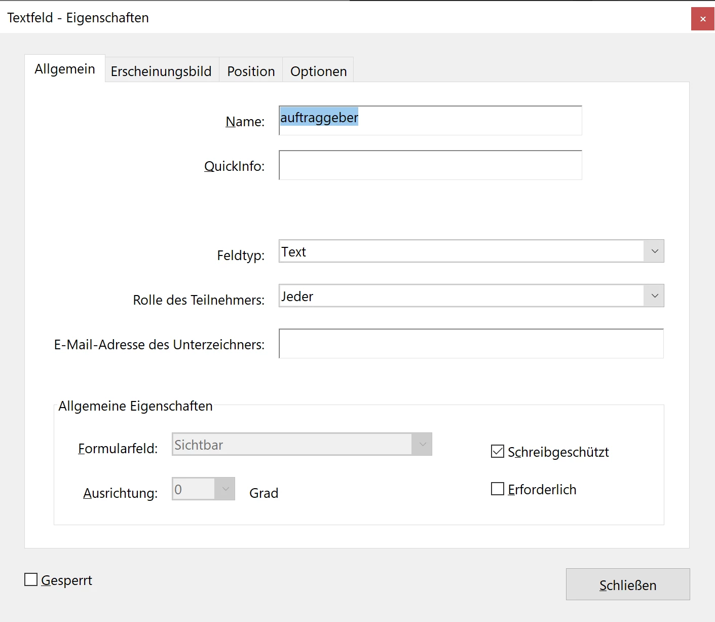 Now I want to do another one and as far as I can say I did exactly the same steps as yesterday, but somehow when I open properties for for any of my fields of my new form I don't have all of the tabs. Here I show you a screenshot of a textfield. It's in German, but you can see that many important tabs are missing.