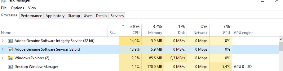 I am having the same issue as many other user here. A process called "Adobe Genuine Software Service (32bit)" and "Adobe Genuine Software Integrity Service" are using 14% CPU each on every computer startup. These 2 processes seem to be related to the service "AGMService.exe". I am having this issue on 2 computers (one of which is new since last week). I have installed creative cloud and only have Adobe DC installed (installed though the creative cloud app) with a corporate liscence (sign in via corporate SSO). I'm on Windows 10 Enterprise v1909. I have tried the link an admin (username Jeff) provided to find the serial number but the link is old and no longer works. Can somone please send me instructions on how to extract the install logs or find my serial, or help me fix the issue please?
