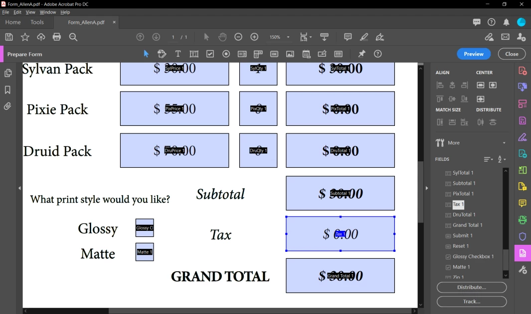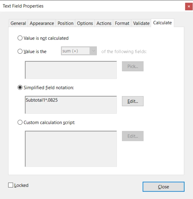 Hi, I'm currently a college student working on a project to create an interactive PDF form using a combination of InDesign and Acrobat. So far I have everything figured out; however, I'm trying to figure out how to format the invoice form to calculate an 8.25% sales tax rate using the information in a "Subtotal" field (the Subtotal being the sum of 3 other fields). Unfortunately, I have not found what formula to use to calculate the sales tax. Attached are what I have so far. I have used "Subtotal 1*0.0825", "Subtotal1*0.0825", and "Subtotal1*.0825" in both the Simplified field notation and the Custom calculation script sections and am unsure of where I'm going wrong. Thank you for any help in advanced!