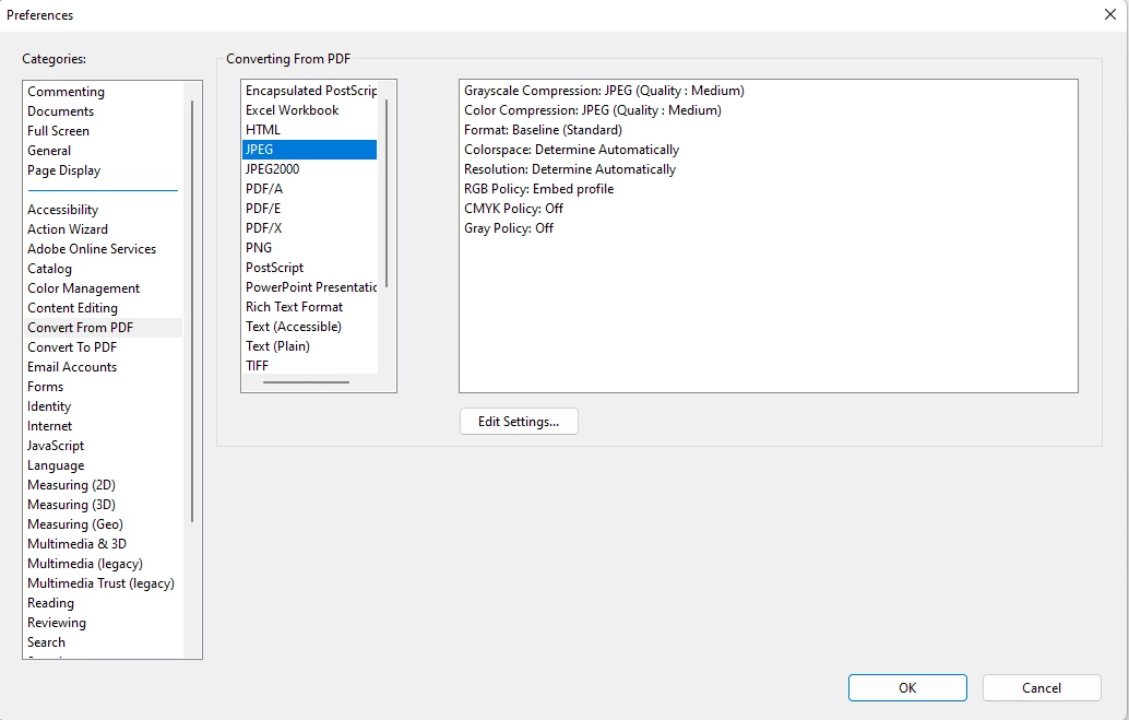 Ich kann TIFF und PNG exportieren, neuerdings aber kein JPEG. Es zeigt sich zwar ein Bearbeitungsbalken aber keine Jpg Datei im Exportordner. Ich habe Acrobat repariert und auch neu installiert, es hat aber nicht funktioniert. Das selbe Problem habe ich auch auf meinem Notebook. Es kann also nur am Acrobatprogramm liegen, evtl. ein Bug?