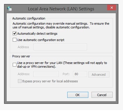 - Select the Automatically detect settings option, and deselect the Use automatic configuration script, and Use a proxy server for your LAN options. Click OK.