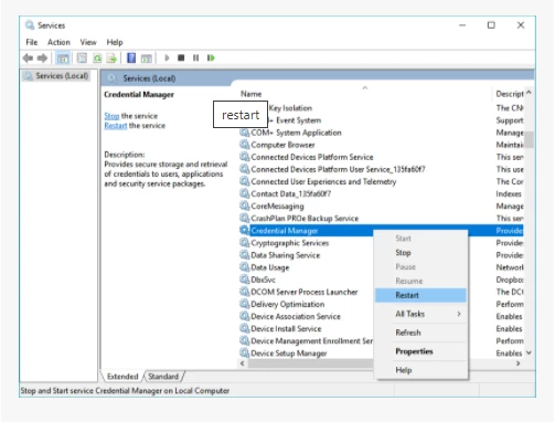 Open Services manager (press the Start key and type Services). - In the list of Services, right-click on Credential Manager.
