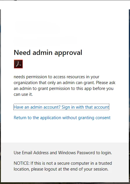 If app registration and admin consent being granted is not done in advance, it's totally reactive and our users will get 'Need admin approval' before they can consume the protected PDF, within our own tenant: