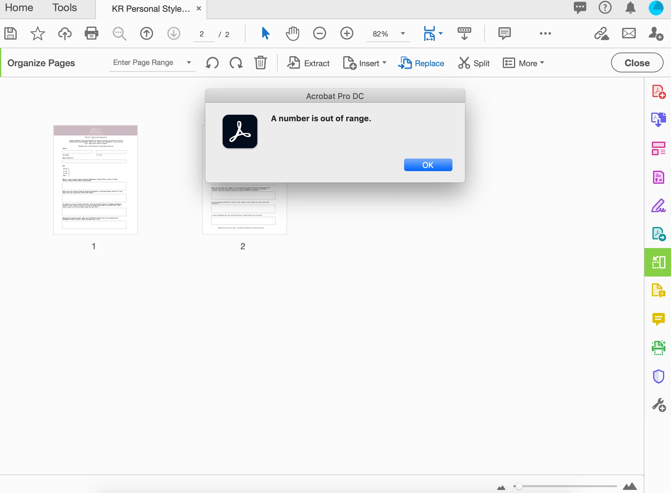 I am trying to follow Try67's recommendations and acrobat is not allowing me to delete any pages or replace my new pages. The application does nothing when I delete a page and when I attempt to replace a page, I am met with the message "A number is out of range". I am usually very computer savvy and have never had any issues with Acrobat, so I am not sure what is happening.