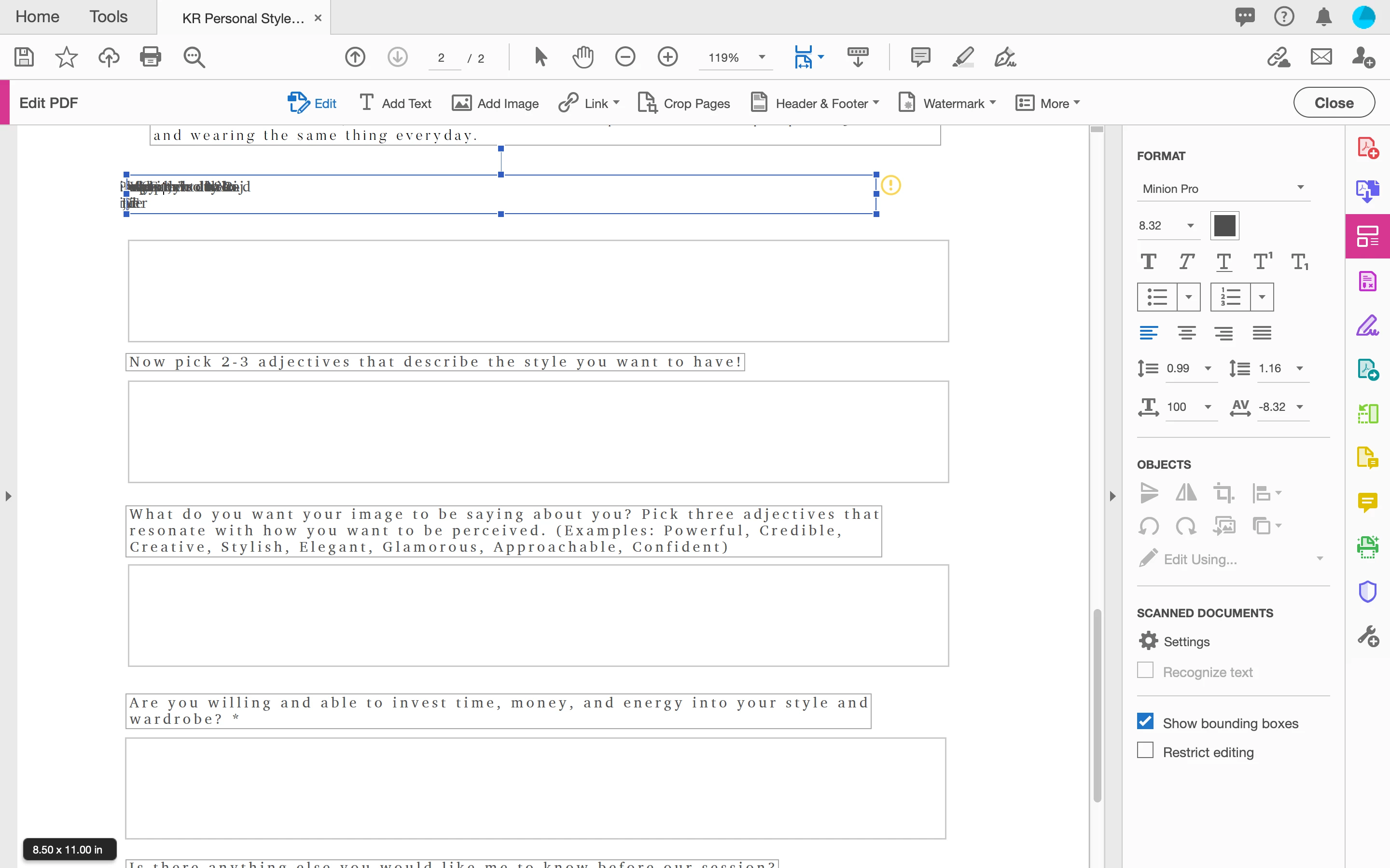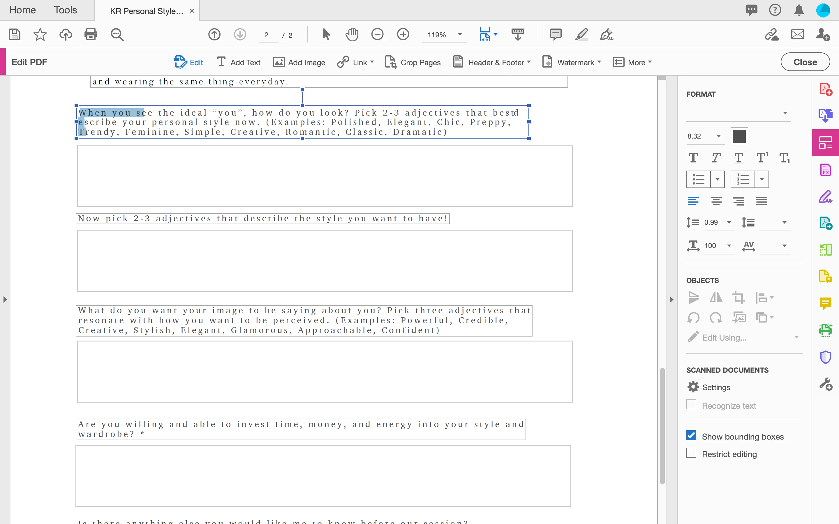I created a pdf file then turned it into a form. I sent the file off to my client to use in her business. There is one small typo, but I can't fix it. The bounding box is normal and looks like it should be an easy fix, but I can no longer select the text. When I try to place my cursor in the box and type, all the text jumps into a single-spaced area, overlapping itself and becoming unreadable.