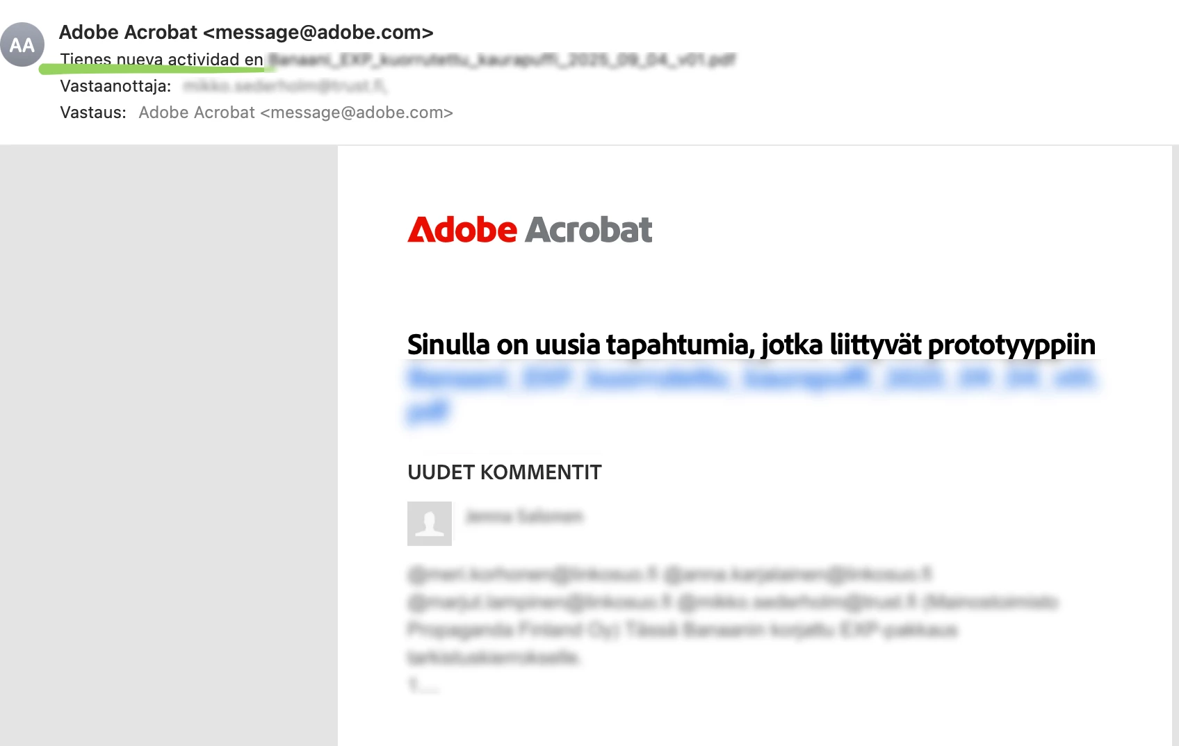 Does any else meet the problem when you send pdf to client for commenting via Acrobat. User interface in in Finnish. But when somebody comment pdf then system send email to recipients then the subject of emailn contain Spanish even the text content of email is in Finnish.
