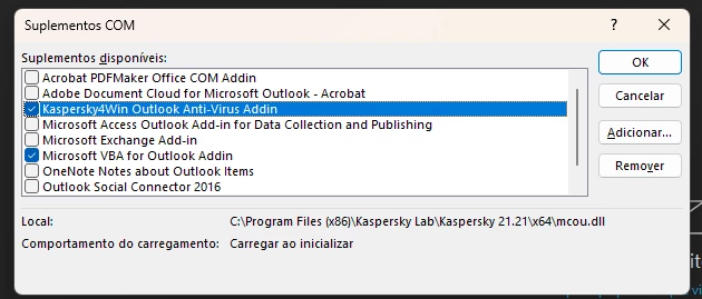 Olá. Meu Outlook 365 está está com problemas para concluir o Envio/Recebimento de emails. Sempre trava em uma conta e fica "eternamente" recebendo ou sincronizando. Desativei os complementos Acrobat PDFMaker Office COM Addin e Adobe Document Cloud for Microsoft Outlook - Acrobat e o Outlook voltou a funcionar normalmente. Esse "bug" já é conhecido? Já tentei reparar o Outlook, mas não resolveu. Só o desativação desses dois complementos resolve.
