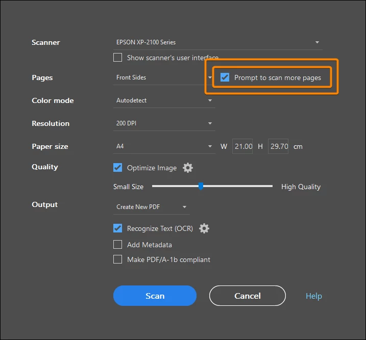 Thank you for your answer but I think maybe my question was unclear. I would like the pop-up box to stop popping up. I'm not using the Adobe Scan option. My desktop scanner takes care of front, back and multiple pages so the pop-up is unnecessary. Until this latest update I had never seen it before and it's a bit annoying.