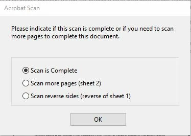 What I do is: I press the scan button on the front of the scanner, a pop up appears that offers me different scanning options, I choose Adobe Acrobat, Acrobat opens, a pop up appears with color options, I choose Auto, the document goes through the scan and all the pages open on the screen. This is when the new "scan complete" window is opening. I haven't changed my scanning process but that last pop-up is new and unnecessary.