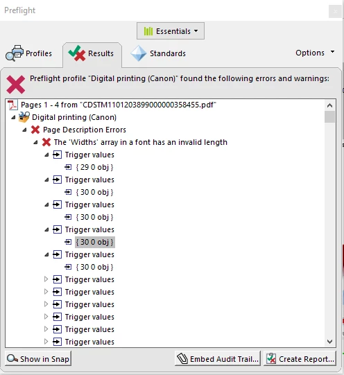 I am trying to troubleshoot some documents for a customer that don't print correctly. When I run a modified version of the Digital Printing (Color) preflight profile in Acrobat Pro DC I get an error category named "Page Description Errors." Under that is a single entry that says "The 'Widths' array in a font has an invalid length" and when I expand that I see a bunch of instances of "Trigger values". When I expand one of the "Trigger values" all that is there looks like: { 29 0 obj }.