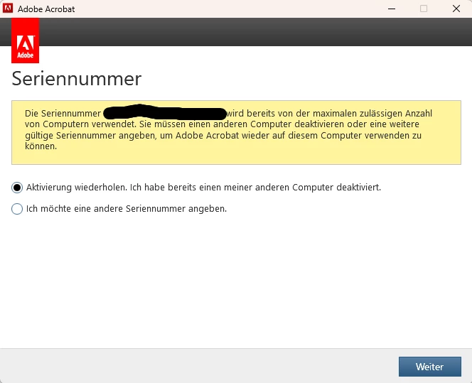 Um ein lizensiertes Acrobat Pro 2017 auf einem neuen PC zu aktivieren sollte ich mich auf dem alten PC abmelden um das Produkt dort zu deaktivieren. Anschließend war eine Aktivierung nicht mehr möglich, weder auf dem neuen noch auf dem alten PC. Es öffnete sich ein Fenster: „Acrobat Licensing Application: Seriennummer. Die Höchstzahl von Computern, auf denen die Seriennummer ... verwendet werden darf, ist bereits erreicht. Sie müssen einen anderen Computer innerhalb von 29 Tagen deaktivieren, um dieses Produkt“ Es werden zwei Alternativen angezeigt: „1) Aktivierung erneut versuchen. Ich habe bereits einen meiner anderen Computer deaktiviert. 2) Geben Sie eine andere Seriennummer an.“