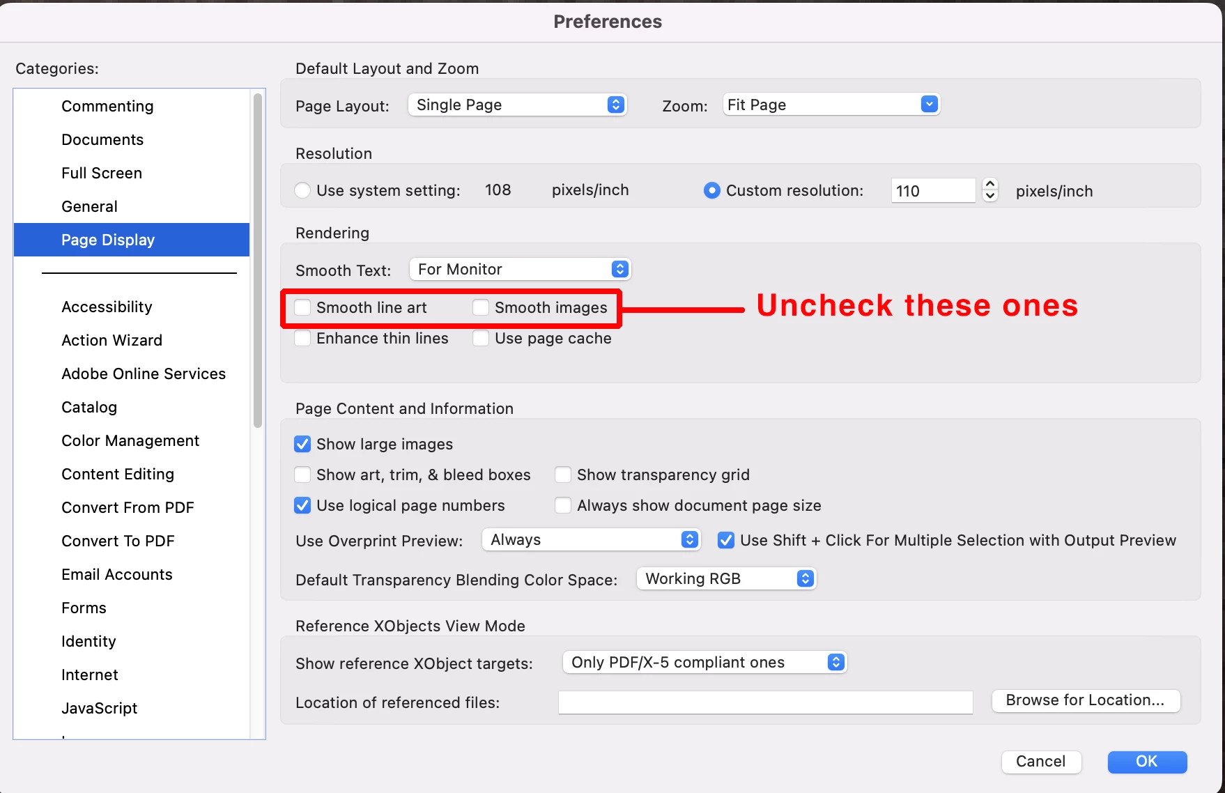 Very pleased turning off these options has solved the issue of redwaring when zooming in.  this is in OSX 12.5 Monterey.  Acrobat 24.  2015 27" iMac.  Is odd as I had tried turing off the whole smoothing which ad not helped.  But turning off the individual checkboxes has.  I did find turing them on again caused the issue to return.  Thank you.