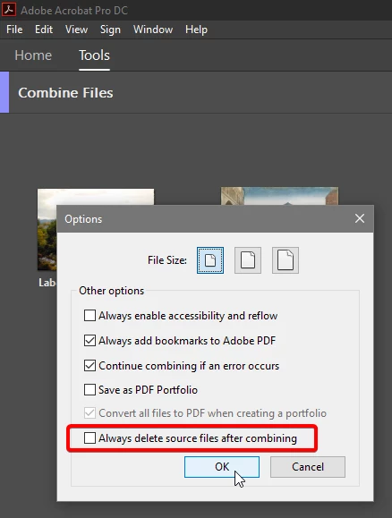 combined multiple files (two jpgs from my desktop) into a pdf. was not paying attention to settings and did not see that "delete source files" option was checked