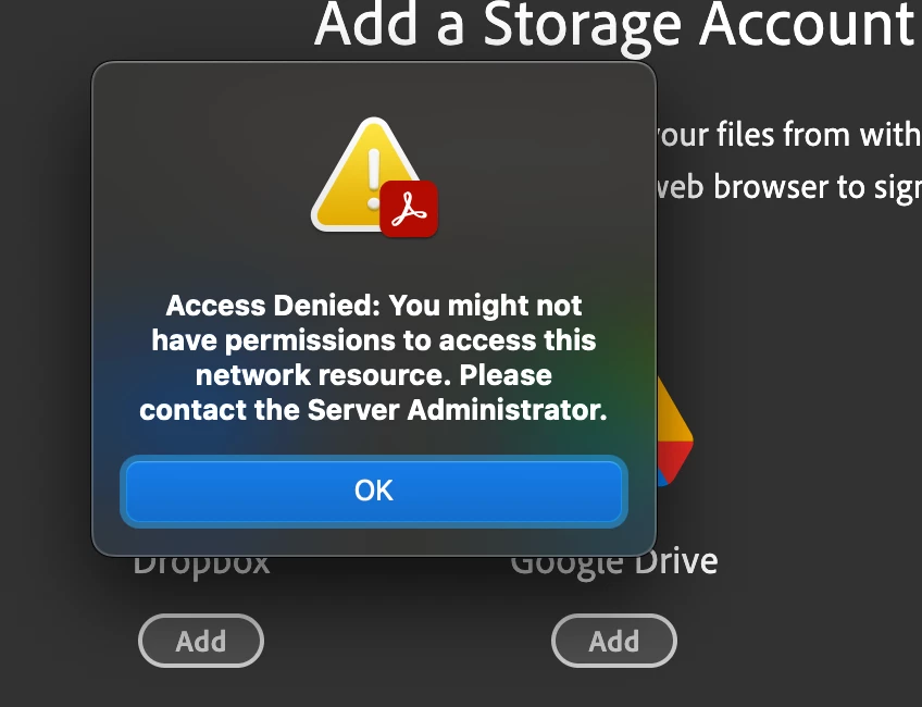 They are on MacOS 14.4, logged into Office365 through their locally installed apps, and logged in both through Chrome and Safari. The URL is correct and they can access in all the ways but adding storage to Acrobat.