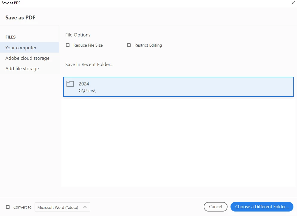I can click choose a different folder which will bring up the windows explorer box, however i would acrobat to default to this as in previous versions, I dont want the extra click.