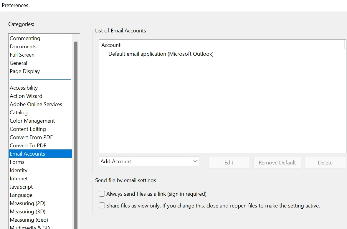 Go to Edit > Preferences > Email accounts in Acrobat or Acrobat Reader on a Windows machine. For Mac, Application Preferences > Email accounts.