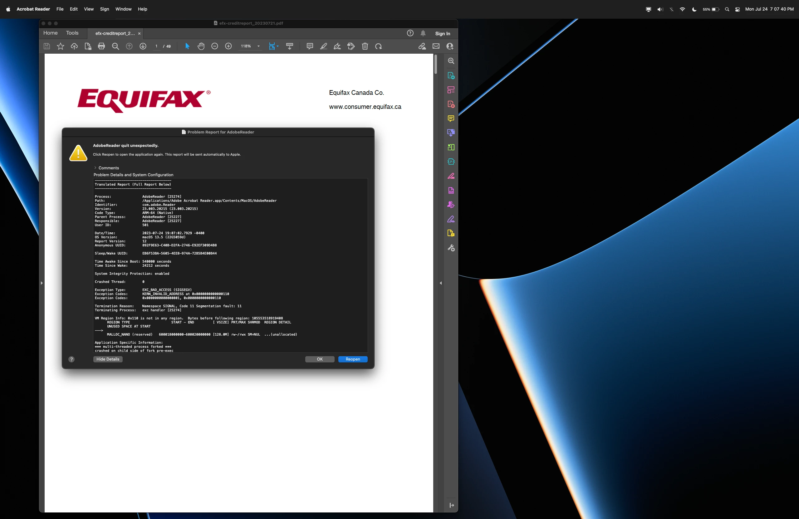 DDD192939944ParticipantForum|Forum|2 years agoJuly 25, 2023Questionacrobat reader keeps crashes on M2 MacForum|Forum|2 years agoJuly 25, 20231 reply1016 viewsi re-installed Adobe acrobat reader 3 times, the support person from adobe told me it should fix adobe from crashing but it does not work i attached a screenshot of what keeps happening every 5-10 mins! im using. a M2 Macbook air Crash or freeze
