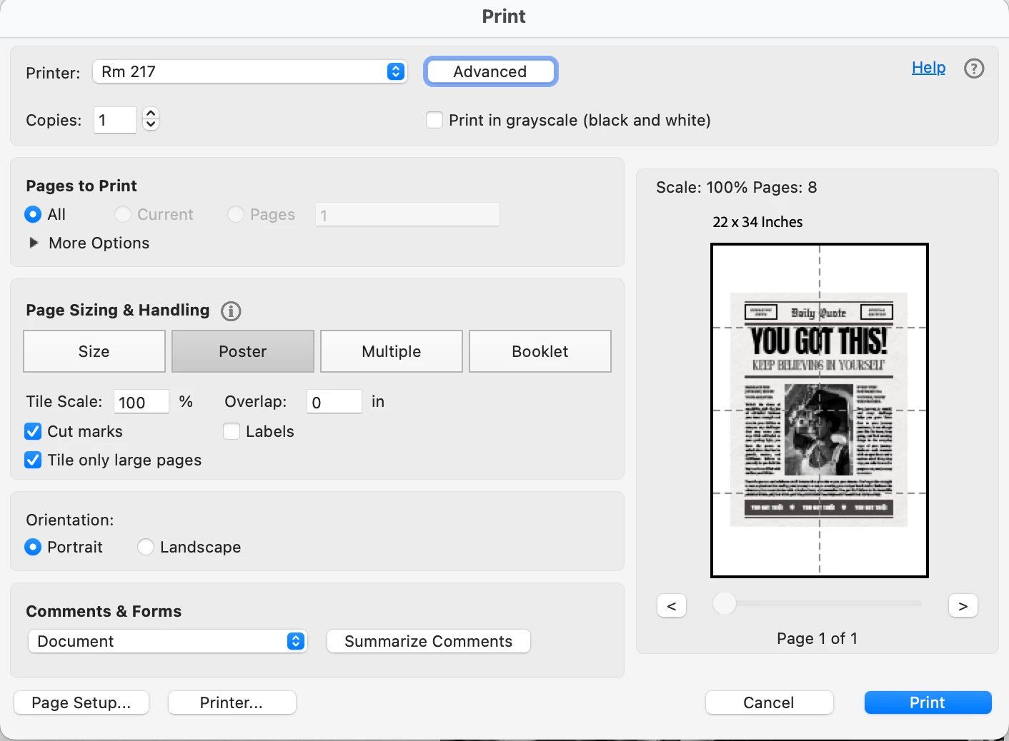 Issue: Acrobat Reader for mac (newest version at time of posting) stopped printing in poster size.