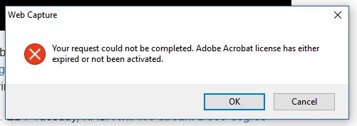 I have recently been receiving this error when using "Convert Webpage To PDF". , "Your request could not be completed..Adobe Acrobat License has either expired or not been activated."