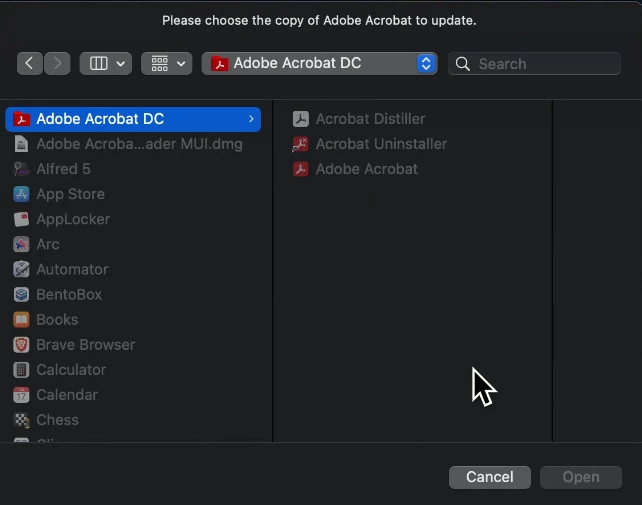 While using the installer, it prompted us to select the Adobe Acrobat application. However, even though the app was visible in Finder, it was not selectable, which resulted in the installation failing.