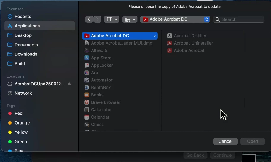 In our environment, we encountered an issue while updating Adobe Acrobat DC to version 25.001.2047x (Optional Update, Apr 28, 2025). The update fails on certain macOS machines.