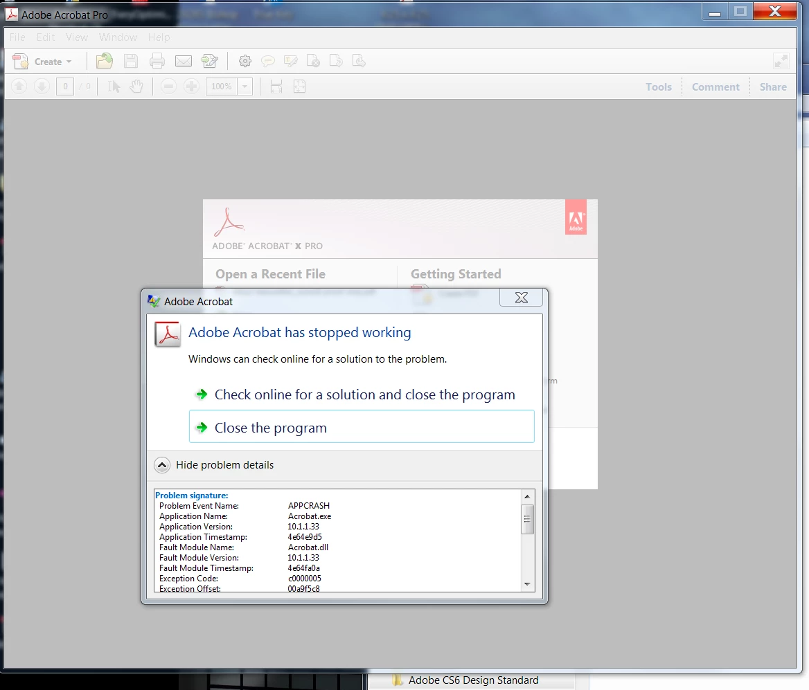 Good morning. we've been having difficulties with Adobe Acrobat X Pro in Windows 7. It's been working fine until recently. It keeps crashing after 20 seconds. I've tried uninstalling, reinstalling numerous times, but it still crashes. Any suggestions?