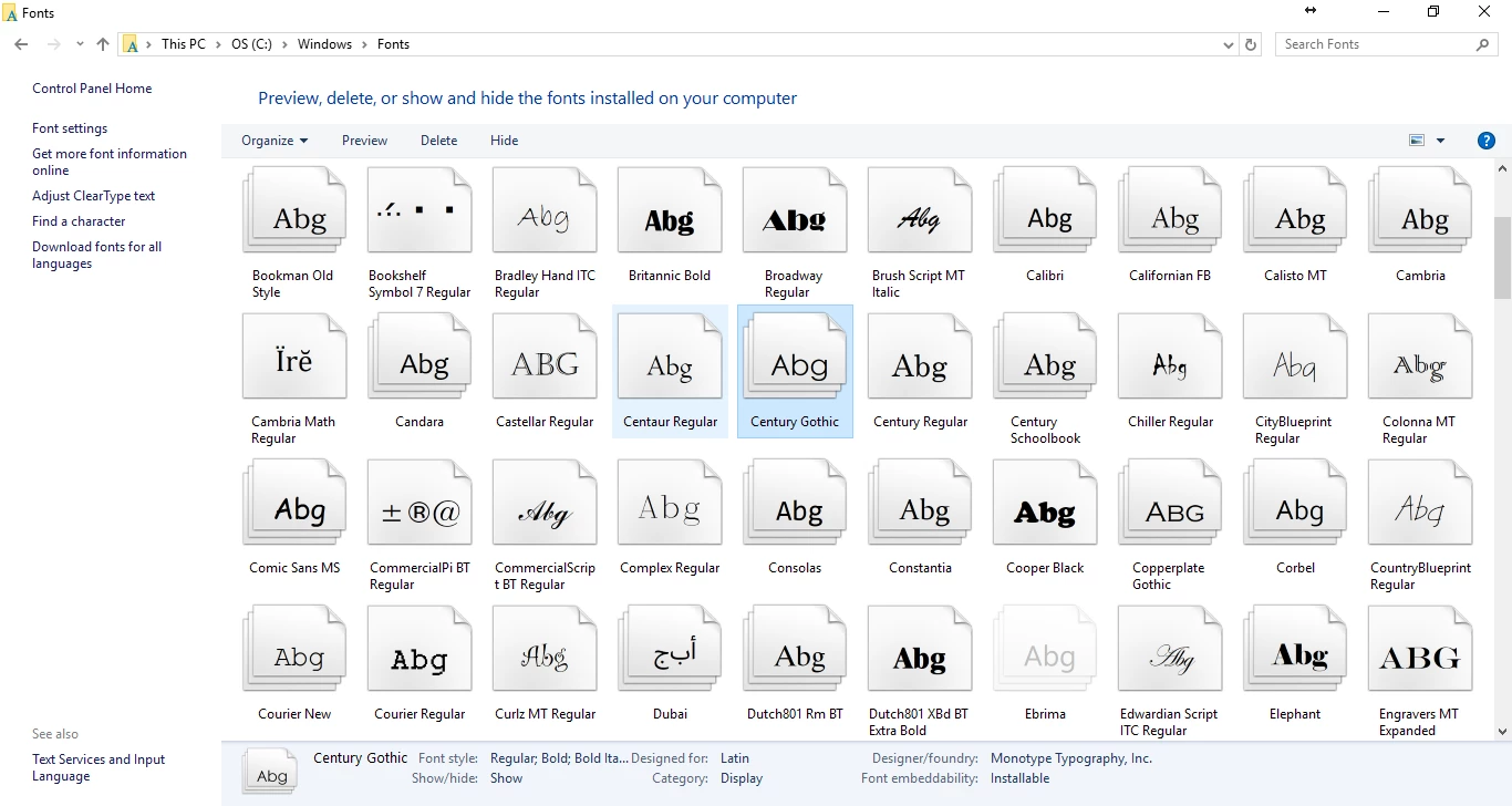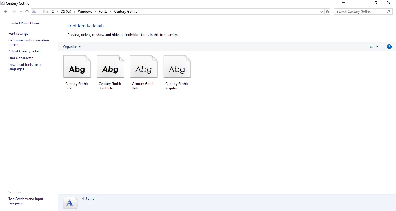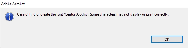"Cannot find or create the font 'CenturyGothic'. Some characters may not display or print correctly."