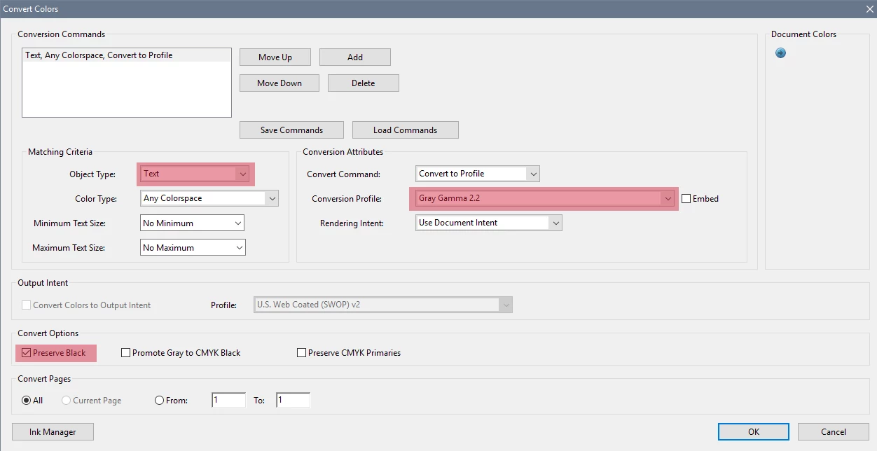 From what I can read online, transforming all the colored text (and not the figures) within a pdf to pure black text (with Acrobat 11 or Acrobat DC) is not possible at this time. This is sad but this is ok. In order to go from colored text to grayscale text, I use the Tools -> Convert Colors toolbox and click on what's indicated in the below figure. It looks like this cannot be automated with a customized action. Is this true? If yes, could this be replaced by a Javascript script (available as a tool to be added in the Action Widzard) that would do the same? Thanks