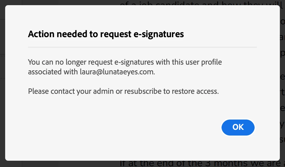 I have two activated devices under my Adobe Acrobat Pro subscription, and both should have access to the e-signature features. We have been using these features without issue for almost a whole year. However, yesterday on July 1, 2025 when attempting to request an e-signature, I received the error message: Action needed to request e-signatures. You can no longer request e-signatures with this user profile associated with <my user email>. Please contact your admin or resubscribe to restore access." The thing is, I am the admin and we have an active subscription with the next payment due on July 24, 2025. Can someone help me understand why this feature is suddenly blocked?