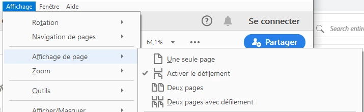 A chaque fois que j'ouvre un nouveau fichier .pdf l'affichage de page est par défaut sur "une seule page", ce qui m'oblige à choisir l'option "activer le défilement" à chaque fois que j'ouvre un document.