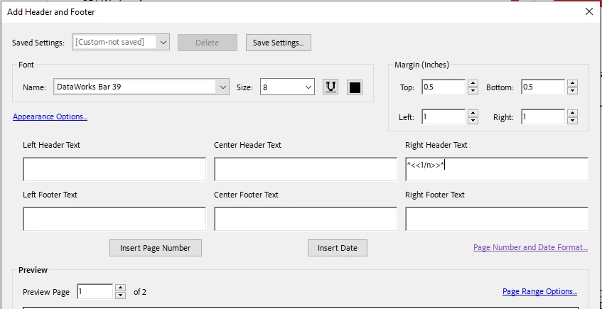 I can get very close with bates numbering inserting the page number but I need to remove the backslash. As shown below, it'll generate a barcode *1/2* but I'm needing a code of *12* or *0102*. For a 3 page document it would be Page 1: *13* or *0103* | Page 2: *23* or *0203* | Page 3: *33* or *0303*. "*" is the start/stop in the reader.