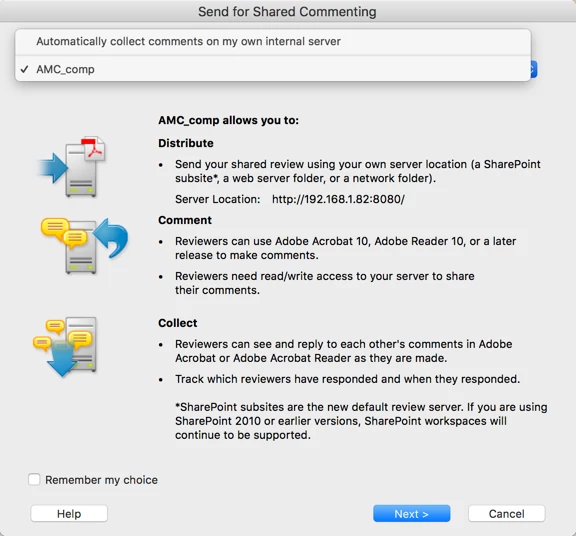 Re setting  up a shared review, are you following the setup in Acrobat? The one where you see this dialog box?
