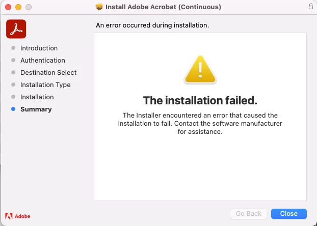 I just got back to work this morning and went to open Adobe Acrobat, only to be greeted with a dialog box saying "The application Adobe Acrobat cannot be opened." I can't drag a pdf to it, and I can't just click on it in the dock, either. I've unstalled it and have tried to reinstall it, but it just says Installation Failed every time. I'm running MacOS Monterey 12.6.3. Creative Cloud says Acrobat is up to date, along with all other installed apps. What is going on and how can I fix it? Acrobat is a must for this office.