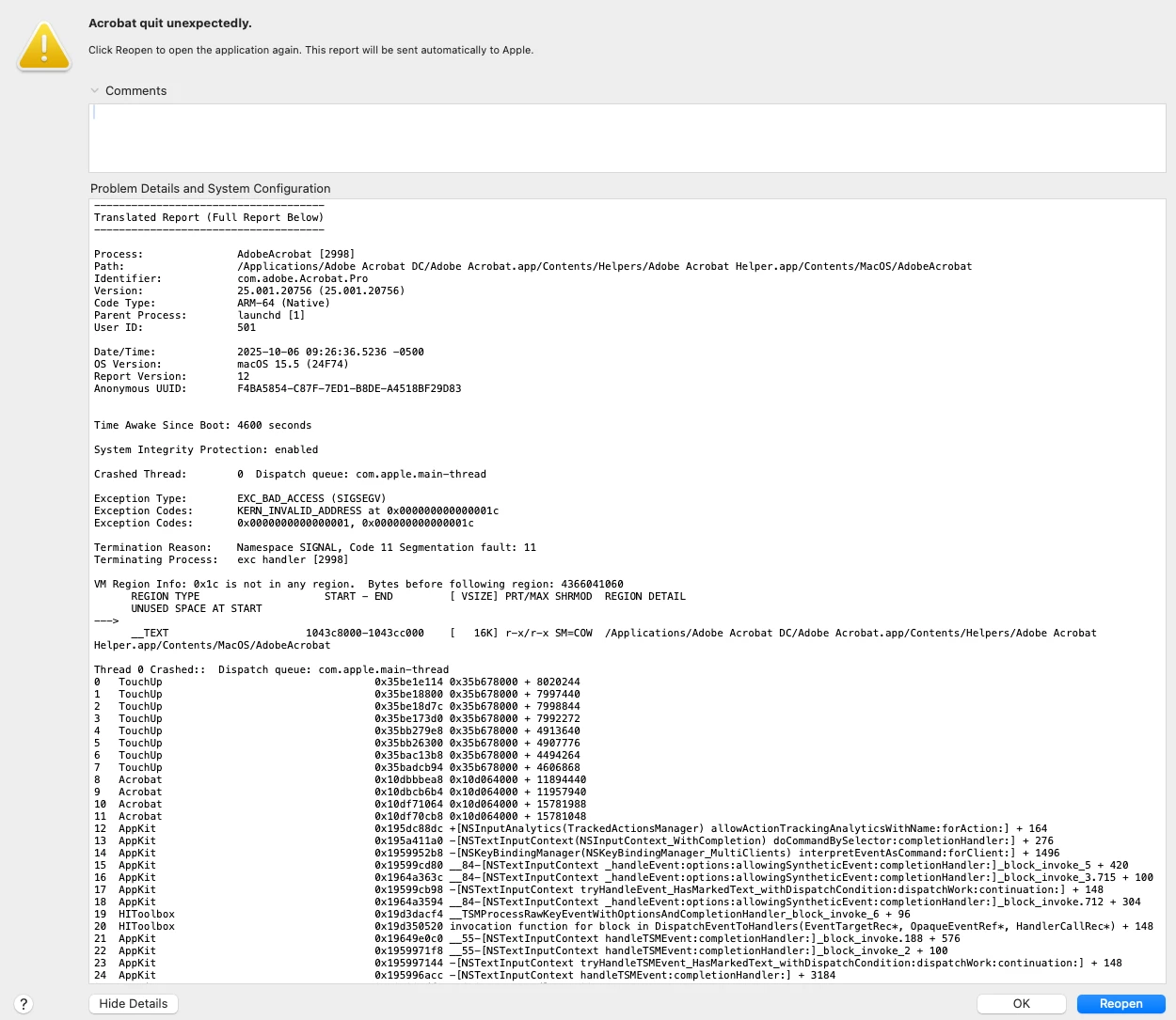 I'm attaching the Crash Log and noting that this happens primarly with the special section Delete button on my keyboard below the FN button. It does not happen when I use the normal backspace delete above the QUERTY keyboard. I can replicate the issue in both New and Classic Acrobat experiences.