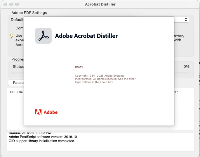 Every time I open Adobe Acrobat, I get these two screens. The only way I can get rid of them is to do a Force Quit of Distiller. I can't move the top box to make any changes to the bottom box. It's frustrating and I don't know what to do about it. I am running MacOS Seqouia 15.3. Please help!