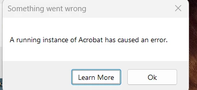Since the update my Acrobat will no longer open. I tried deleting and reinstalling. This caused it to work again, however has no reverted back to freezing. I am getting the following error.