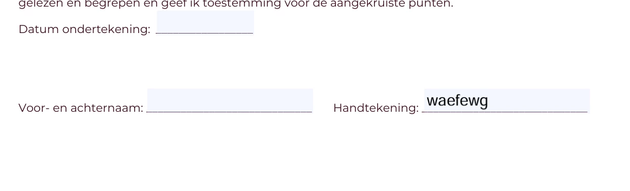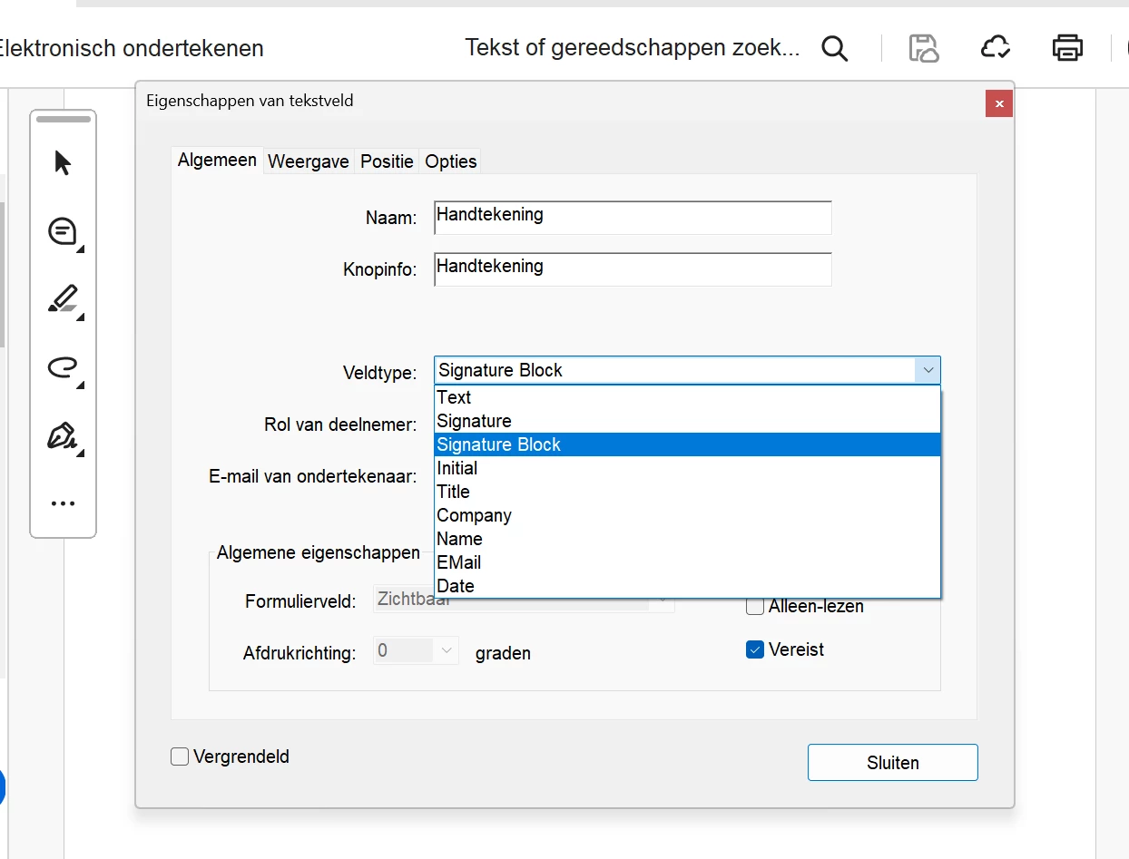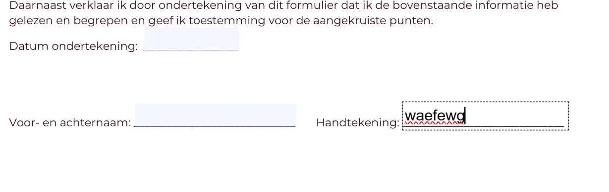 Als ik het formulier download in PDF kan ik er geen handtekening inzetten. Ik kan alleen tekst typen. Dit maakt niet uit of ik kies voor "Signature" of "Signature Block".