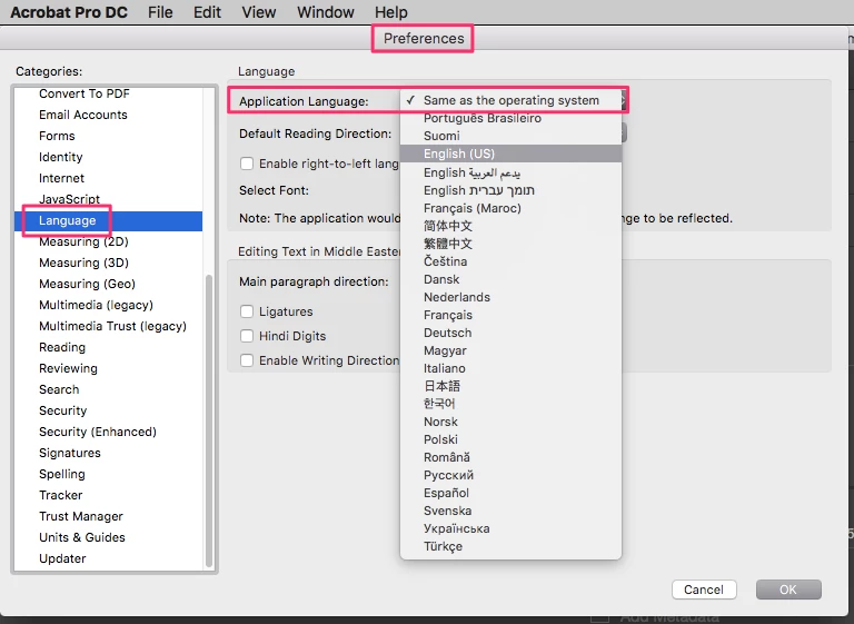 Adobe Acrobat DC pro is stuck in Japanese. I cannot change it to English. I have attempted to uninstall and reinstall the program but nothing changed. I have changed the language setting from Japanese to English, and restarted the computer but it remains Japanese. Please help.