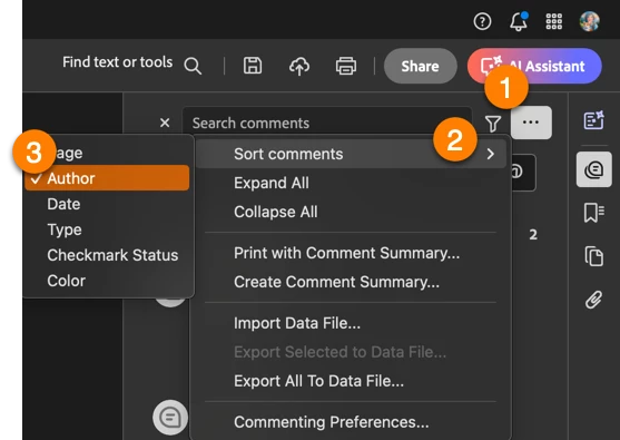 In Adobe Acrobat, when multiple rounds of comments are made by a person, is there a way to group the comments by version?