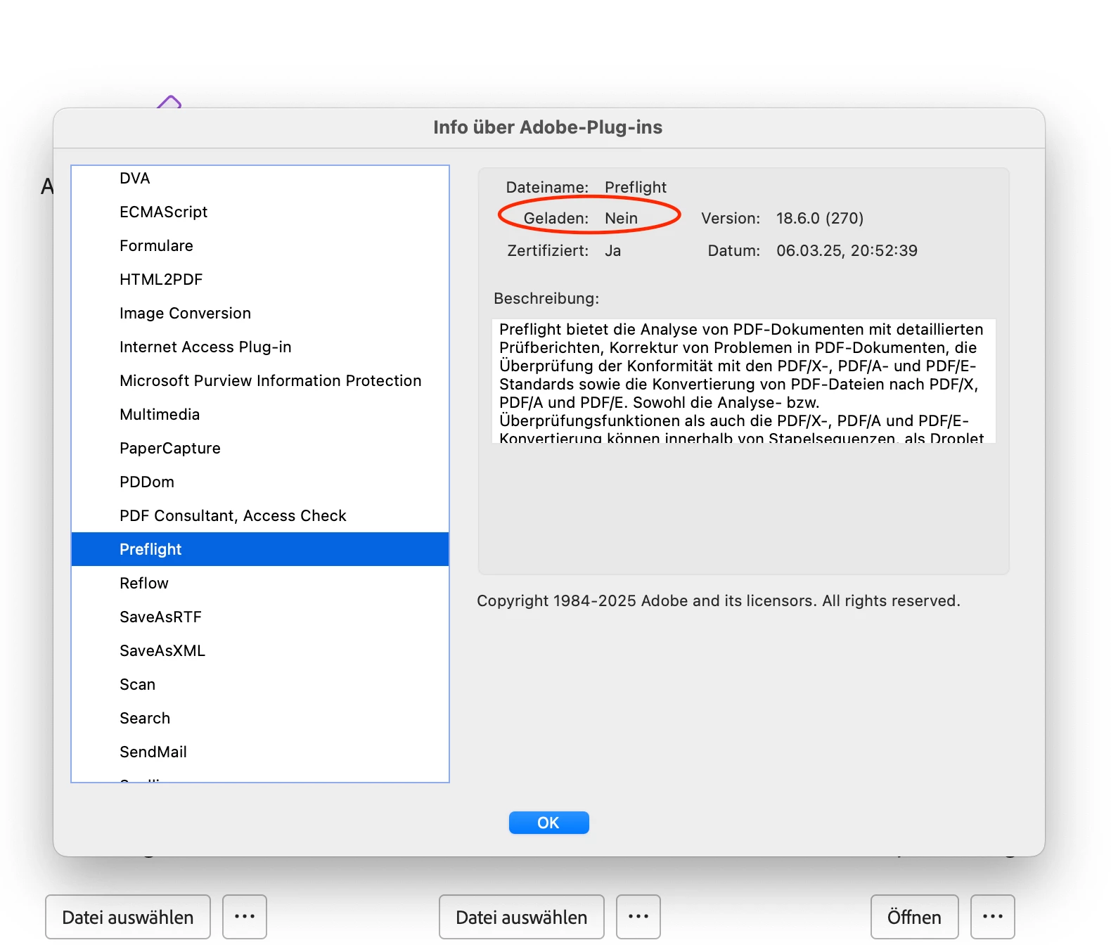 Wenn ich bei meinem Mac unter Acrobat > Info über Adobe-Plug-ins schaue, sehe ich, dass manche Plugins wohl auch nicht geladen wurden. Ich sehe aber niergends eine Option, um diese herunterzuladen. Habt ihr eine Idee, was ich tun kann?