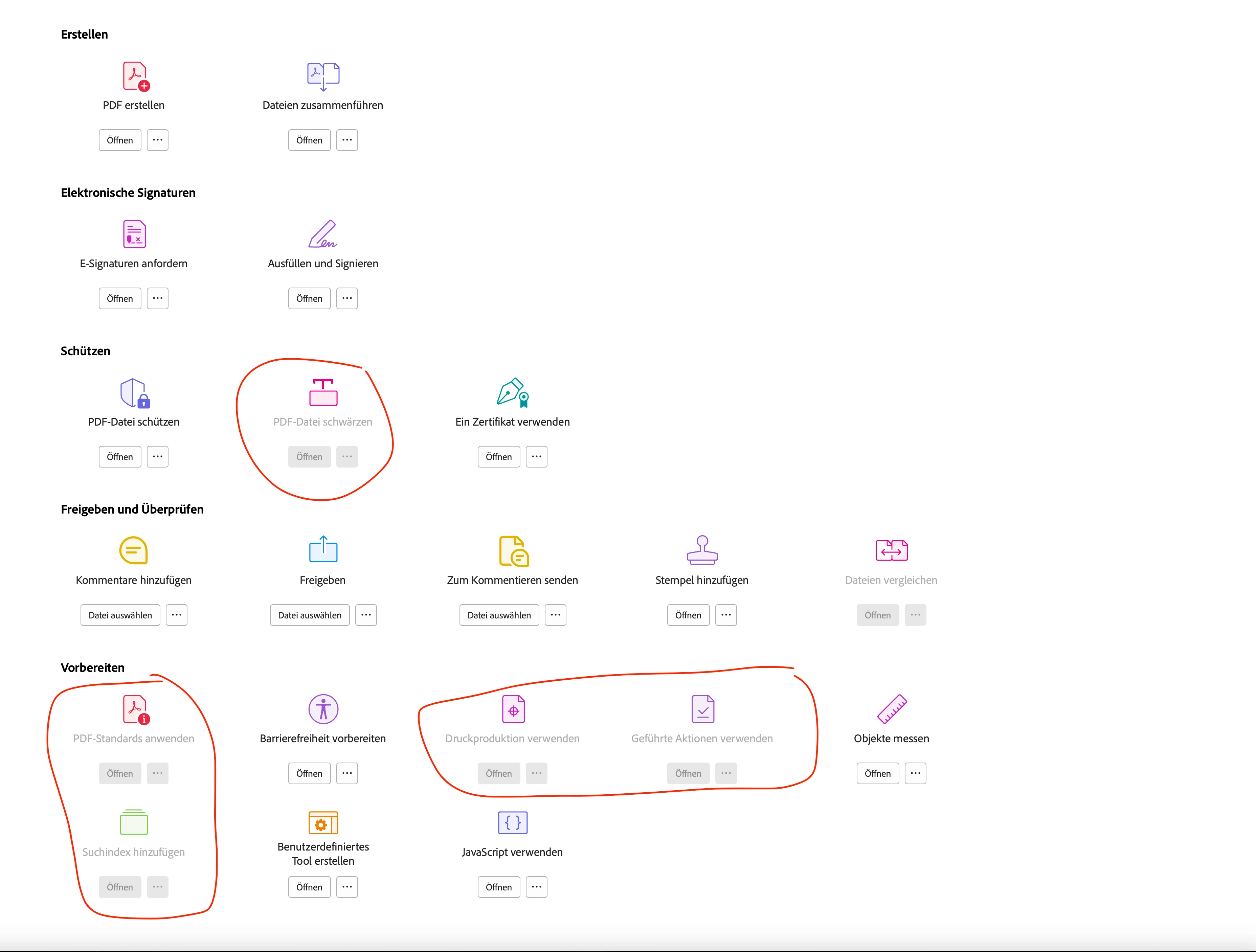 Seit ein paar Wochen fehlen mir einige Tools in Adobe Acrobat Pro. Eine Neuinstallation oder die Erteilung aller möglichen Rechte hat nicht geholfen. Folgende Tools werden mir zwar angezeigt, sind aber abgegraut: